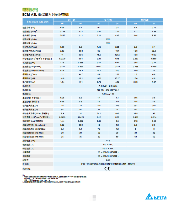 ECM-A3 系列電機為高精度泛用型永磁式交流伺服電機,搭配 200 ~ 230 V 交流伺服驅動器 ASDA-A3 220 V系列,其功率范圍由 50 W 到 750 W。電機框號有 40 mm、60 mm 、80 mm 三種尺寸,提供 ECM-A3H 高慣量和 ECM-A3L 低慣量機種,額定轉速 3000 r/min,最大轉速 6000 r/min,ECM-A3H 最大扭矩范圍為0.557 N-m 到 8.36 N-m ,ECM-A3L 最大扭矩范圍為 0.557 N-m 到 8.36 N-m。